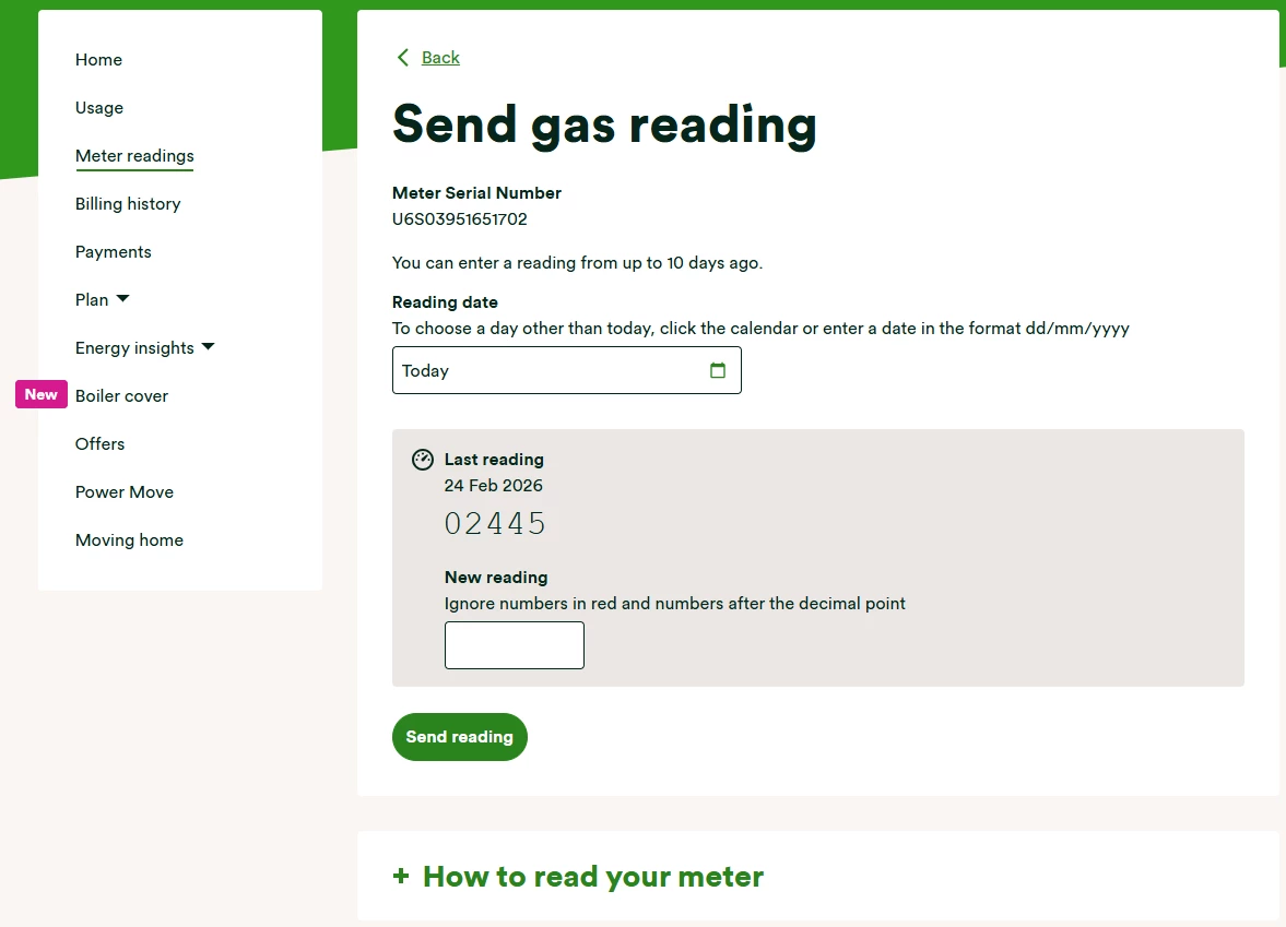 It’s worth checking the reading you’ve taken against the last reading. The new reading shouldn’t be a lower number, unless your meter’s faulty. You can then type today’s reading into the box (or boxes for an Economy 7 meter) provided.