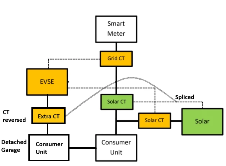 wired downstream of the Solar/Batter CT clamp from the Consumer Unit so it sees (monitors) the