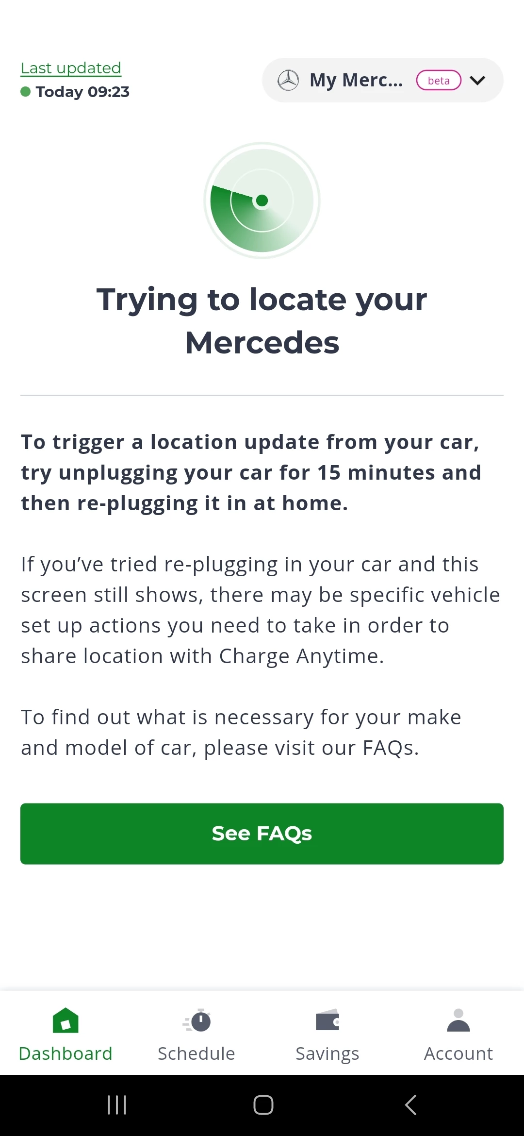 Initially this started in April with a few charging sessions not being picked up by the app or being logged, but then seemed to work itself out and I didn't have any issues since until a week ago. I charged the vehicle via the Easee app, but the charge anytime app was stuck on a last updated date 5 days earlier and wouldn't update. The app wouldn't update at all so from posts on here it looks like the way to resolve is to delete the account and create a new account so the app can pick up your address location again. I did this last night, which seemed to work and I could see the car was charging through the app but when I checked an hour later the 'last update' information hadn't changed. I woke up this morning and went to check the app but weirdly I had been logged out completely and had to create another new account - now all I see is 'Trying to locate your Mercedes' (screenshot included). Again the app won't locate or update with my car.