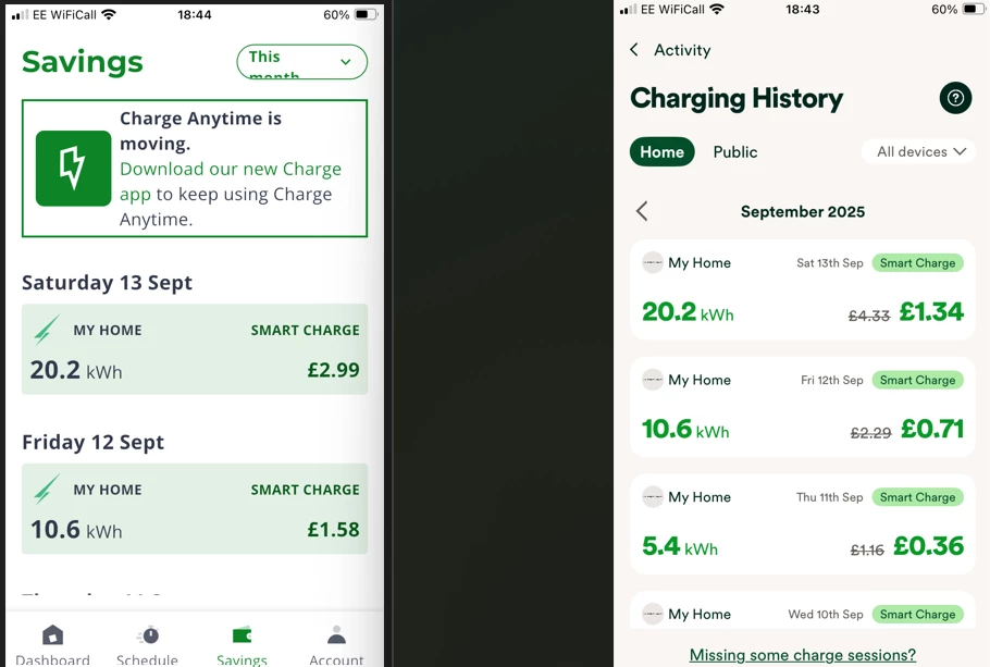 Both Apps now have the history, so looks like OVO have sorted that. The main difference is that CA App shows savings but OVOCharge shows the actual charge. Thats ok its just the straight opposite in the calculation. The history is not entirely consistent down the list but is near enough.