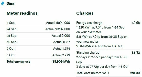 I would assume then that your gas bill has been estimated for that time. If that was done to me, it would cost me a fortune if they used what would be the average usage for a house of our size and occupation. According to OFGEM, the typical annual gas usage for us would be 11500 kWh. My actual usage for the past year is 5610 kWh. Your bills should show if estimates have been used since your meter stopped sending data. Do you still have bills from before the meter stopped working? When they come to remove/replace your meter, in theory, the readings for the last 13 months should be stored in the meter. The new meter will start from 0000 and the closing reading from your old meter is needed to make sure that you are billed correctly up to the time of its removal. This is what my gas bill details looked like for the month my old meter was replaced with my new one. (September 2023).