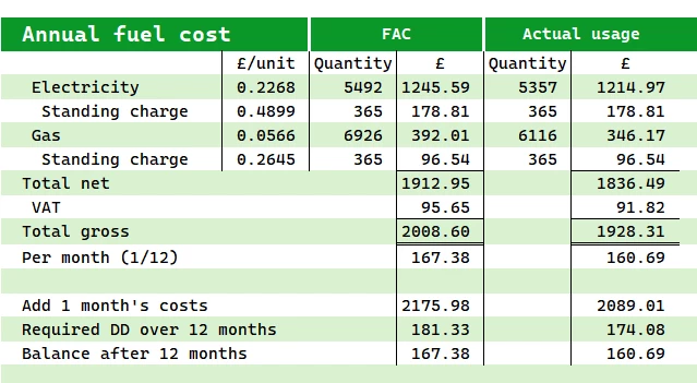 Electricity annual consumption 26695 - 21338 = 5357 kWh, FAC 5492 kWh. Not far off - nine average days’ worth, so probably within any error introduced by the difference in reading dates.