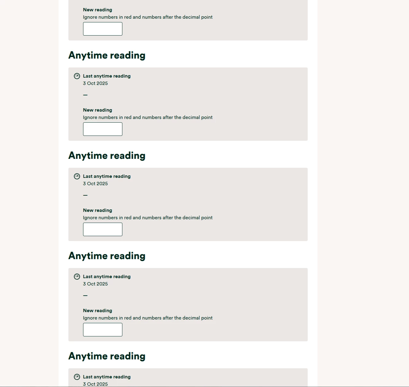 Today, I have logged in to put in my reading and the page looks like this. Instead of one window to put my reading in, there are seven. I enter one, and each separately, and then all of them….but cant get past the ‘Oops, your reading doesn't look right’ error.