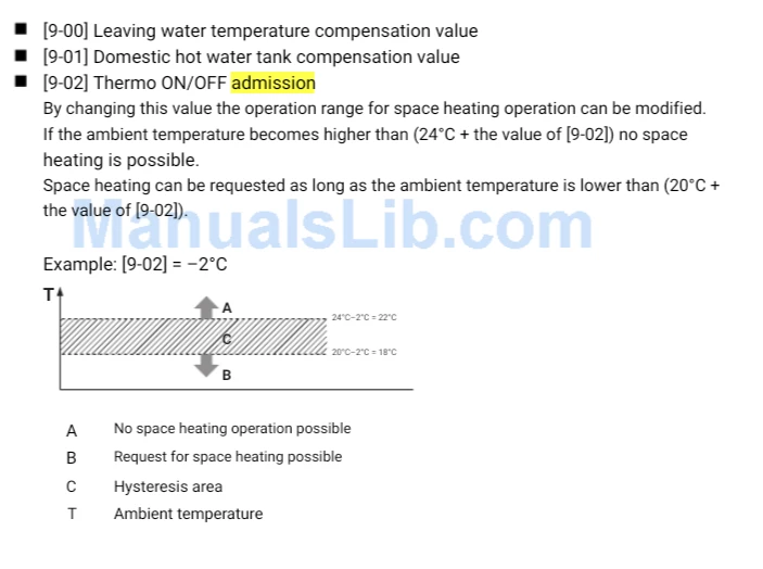 - Description: This setting defines the temperature compensation or hysteresis (deadband) for the thermostat's ON/OFF control logic. It adjusts the threshold at which the system admits (allows) operation based on measured temperatures (e.g., leaving water or ambient). Essentially, it prevents short-cycling by creating a buffer around the setpoint where the system won't toggle on/off unnecessarily. Positive values make the system less sensitive (higher threshold for activation), while negative values make it more sensitive (lower threshold).