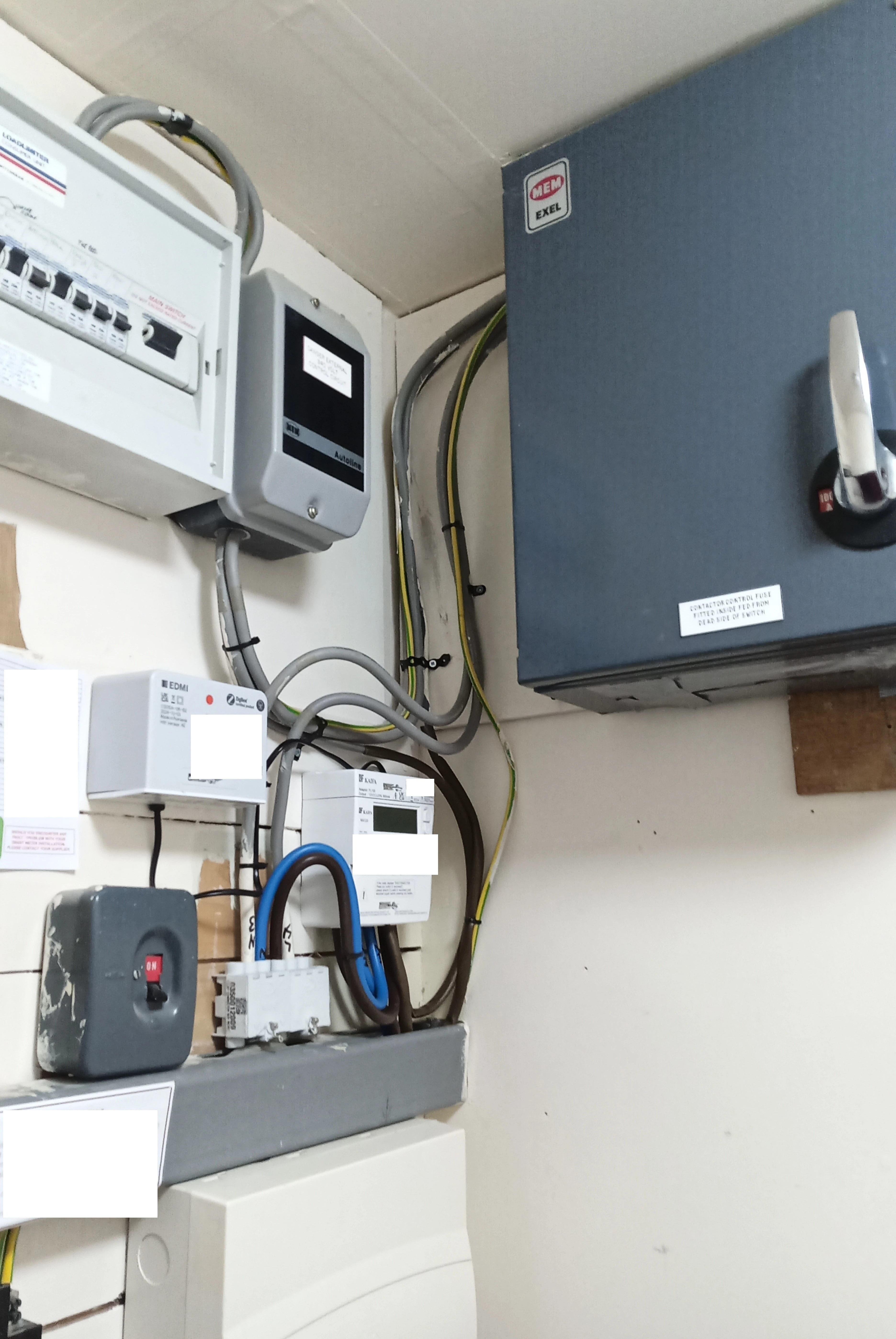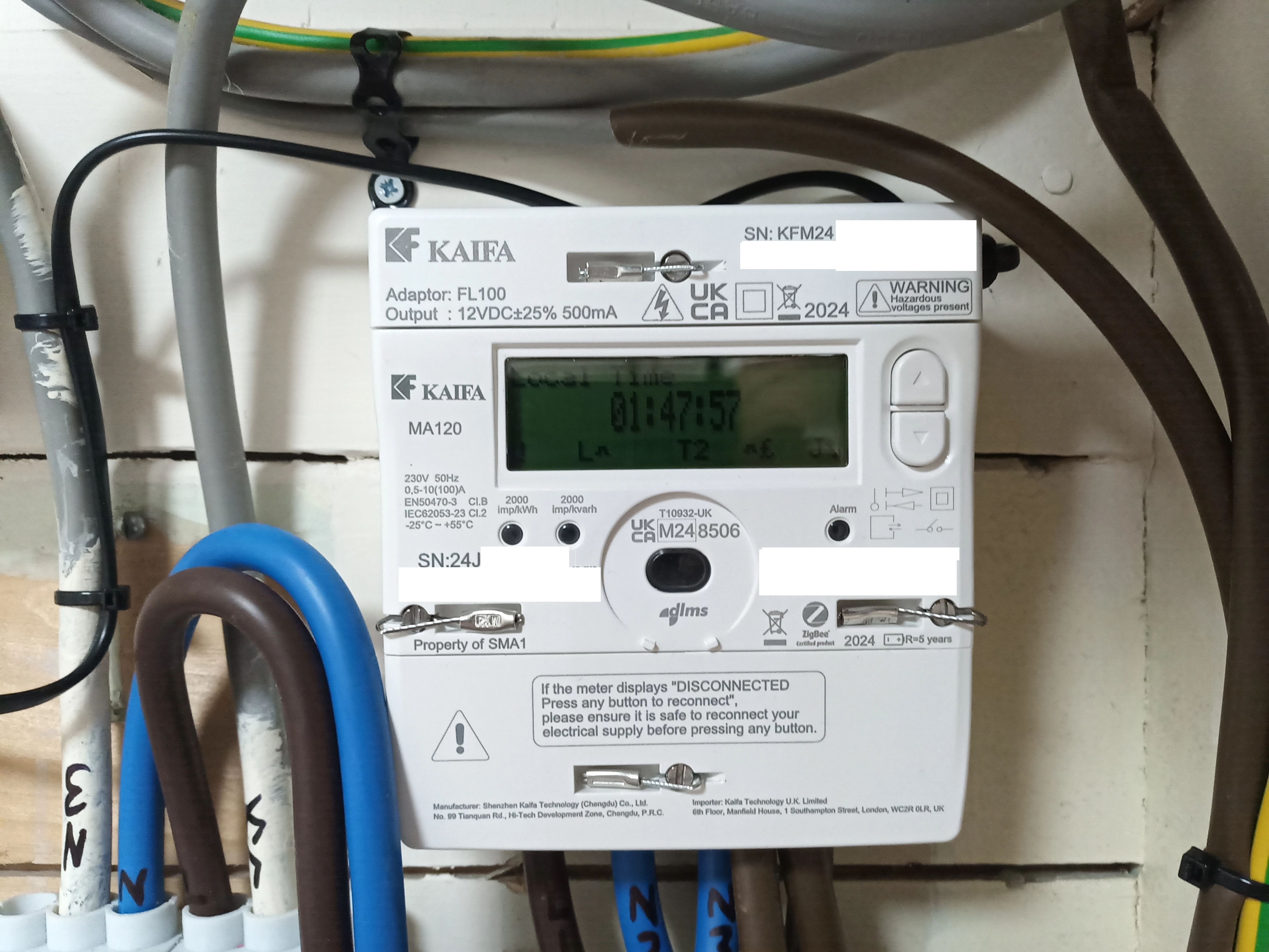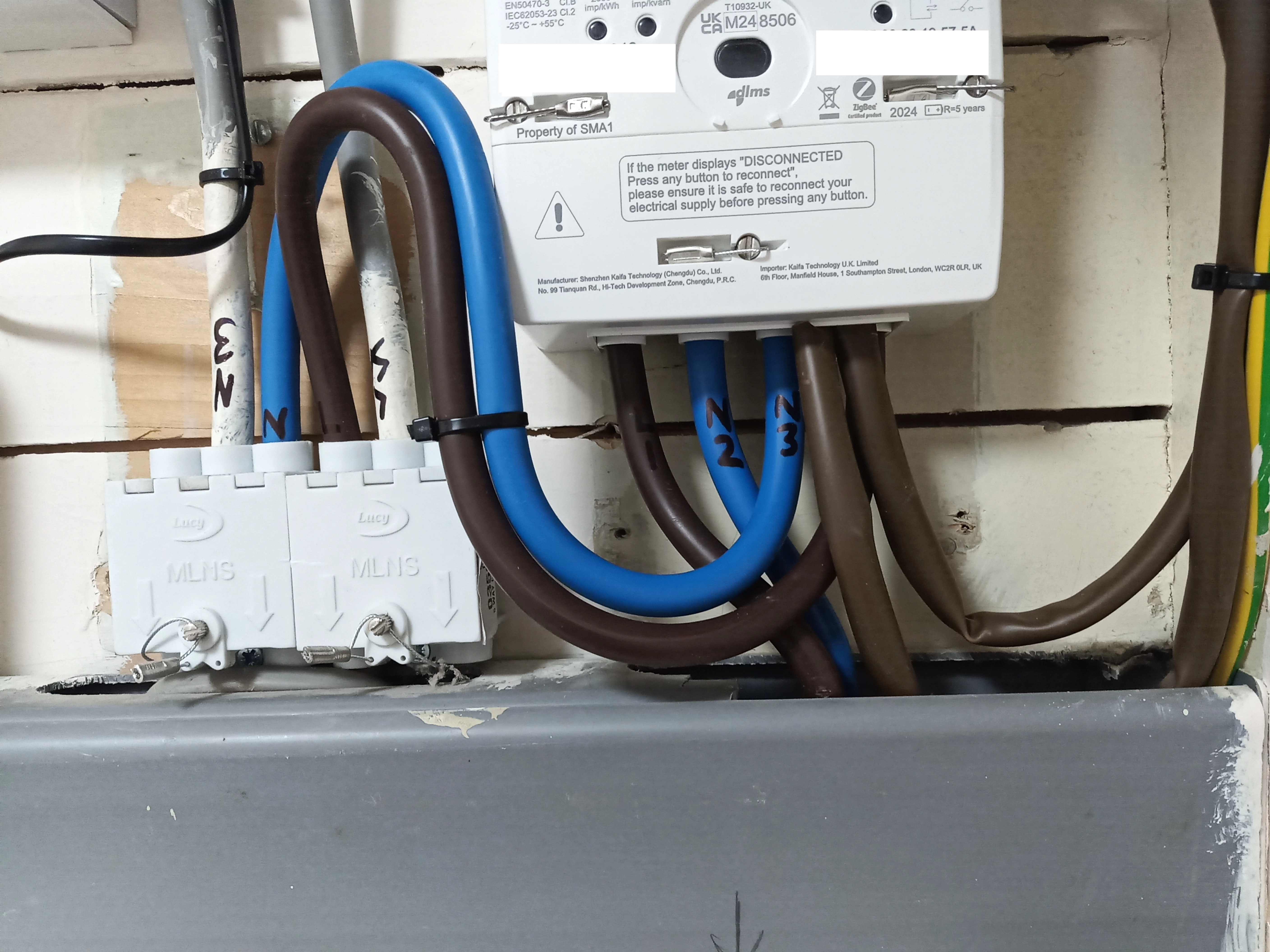 The EDMI unit is the comms hub, connected to the meter by means of the KAIFA FL100 Flying Lead. I suspect the engineer thought it would be easier to do this rather than juggle all those 25mm cables to make room for the comms hub on top of the meter where it would normally be. (All it does is provide a 12V DC supply to the comms hub; the communications from the meter are done over Zigbee. I don’t know why it’s made so complicated ...)