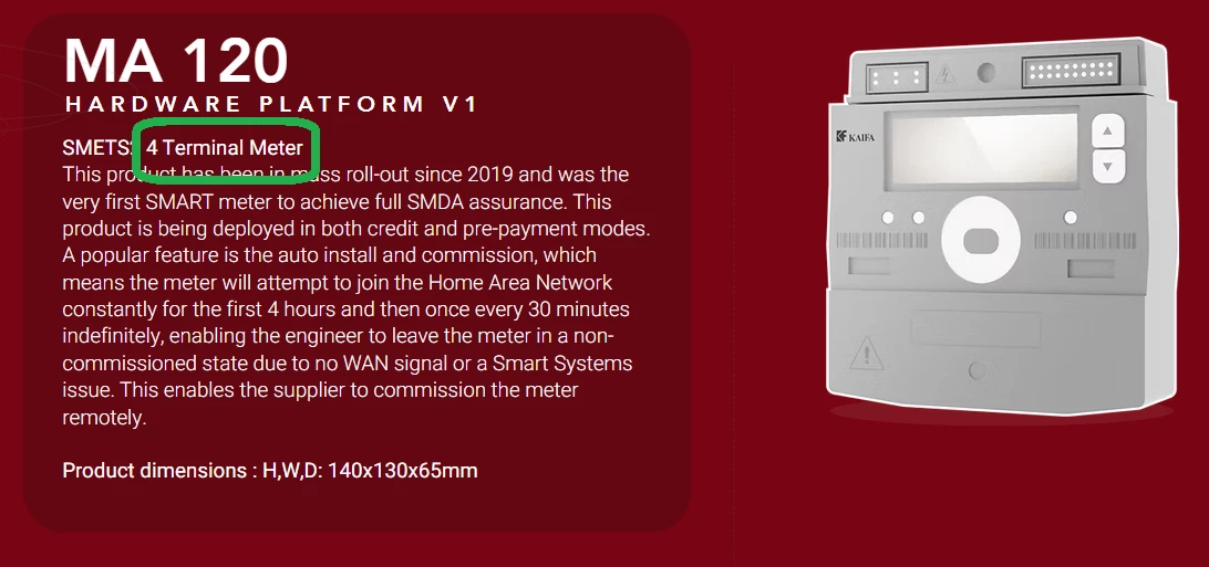 In any case, this is most probably a variant of the Kaifa MA120B (not MA100 as you wrote above), the ‘B’ signifying the fifth tail for the switched circuit. The sparse documentation I’ve been able to find indicates that the variant with buttons arranged vertically is V1, while the later V2 has buttons arranged horizontally. The first two digits of the meter serial number (MSN) which you so carefully hid from us give the year of manufacture; it may well be that the latest variants have reverted to vertical buttons again.