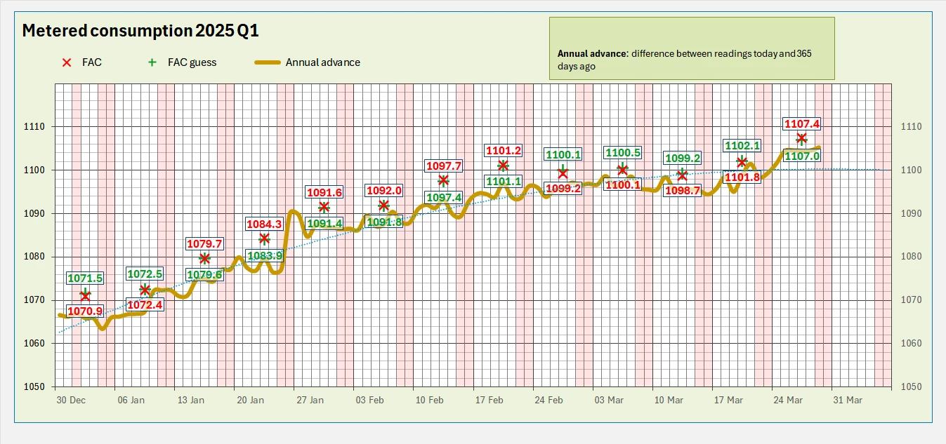 This question has been exercising me ever since my SMETS1 meter was exchanged for a SMETS2 model in 2023. Nothing I read anywhere could explain the odd FACs I was seeing. I eventually discovered that, despite what the documentation says, all historic data preceding a meter exchange (MEX) are discarded. The FAC is then calculated on the basis of actual consumption and a notional figure (the EAC) provided by 'industry'. That notional figure is also allegedly based on a nominal starting value, adjusted periodically for actual consumption. This just didn't happen for my account for a number of reasons, so it wasn't until a year after MEX that my FAC reached parity with actual consumption for the preceding year. Since then, my FAC has been quite reasonable, but it's not the same as the actual metered consumption. I think I've found a way to predict the FAC that tallies pretty well (but not precisely) with the published figure. These are the results so far this year: