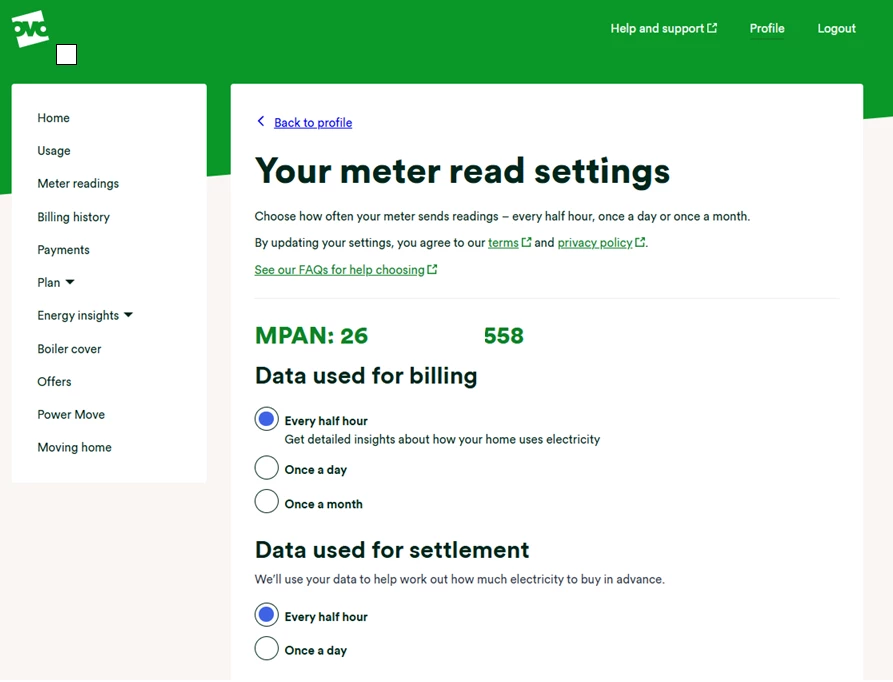 On the Profile scroll down, and click ‘View settings’ under the heading ‘Set how often meter readings send’