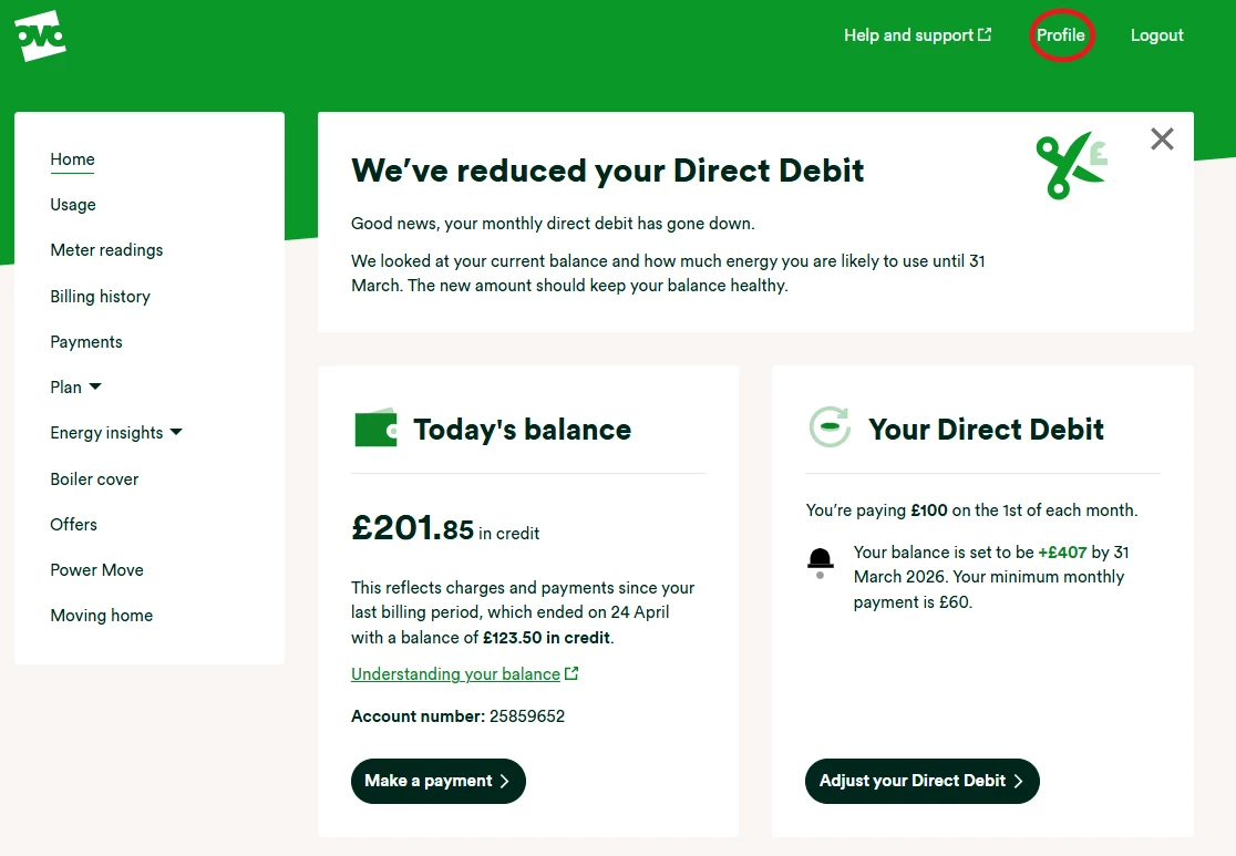 On the home screen of your online account click on ‘Profile’ (or the person icon on the App):