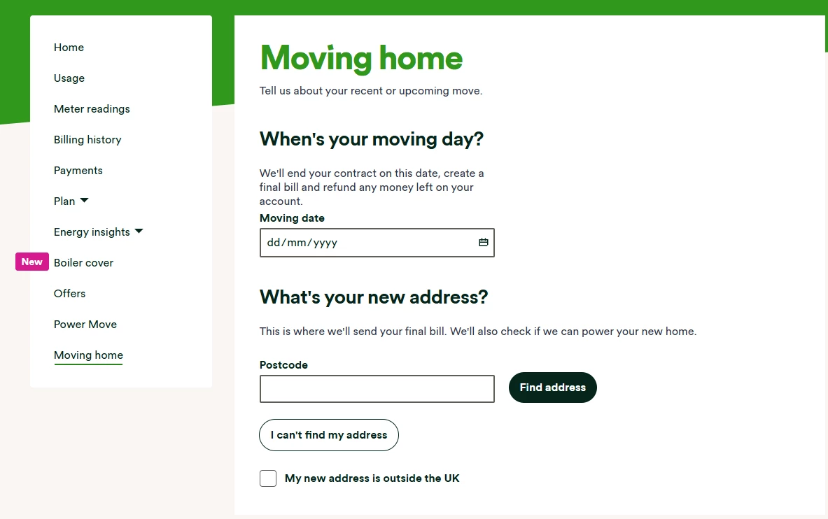 If your moving date falls within the next 28 days, or you’ve already moved, put your moving date in the day, month and year fields. You’ll then need to enter your postcode and click ‘find address to enter your new address. We need this so we can send you your final bill, and also offer to supply your new home.