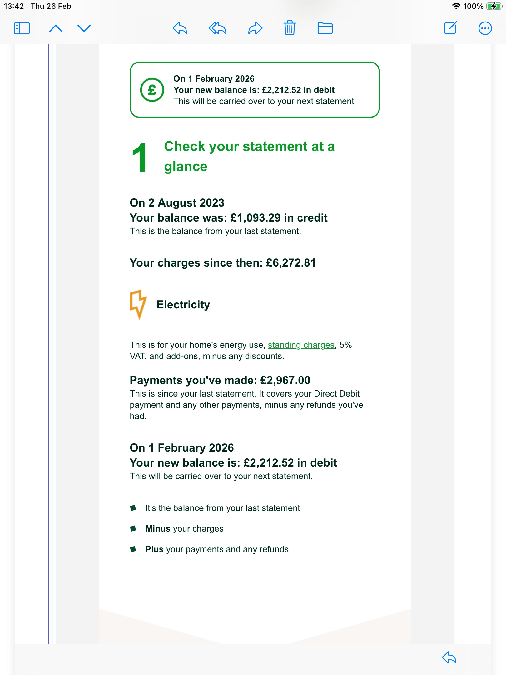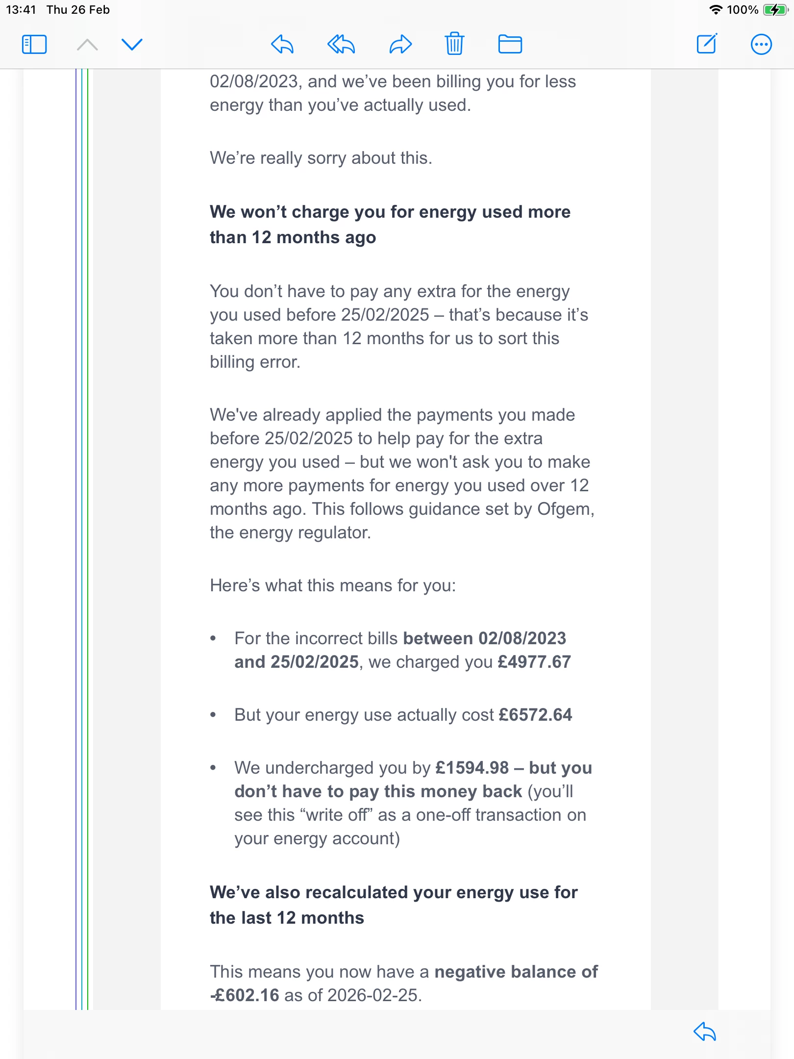 He has just received a email saying since Aug 2023 to 2025 he has been undercharged instead of £4977.67 which he’s paid he should have been charged £6572.84.