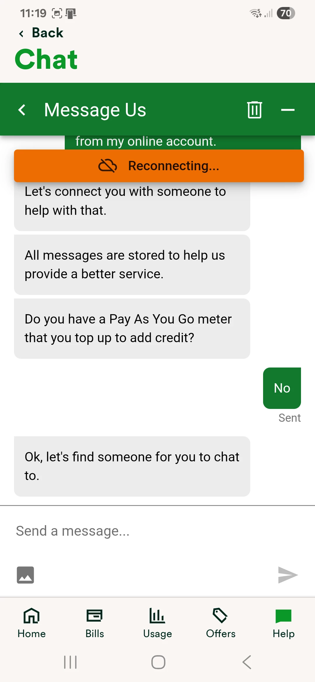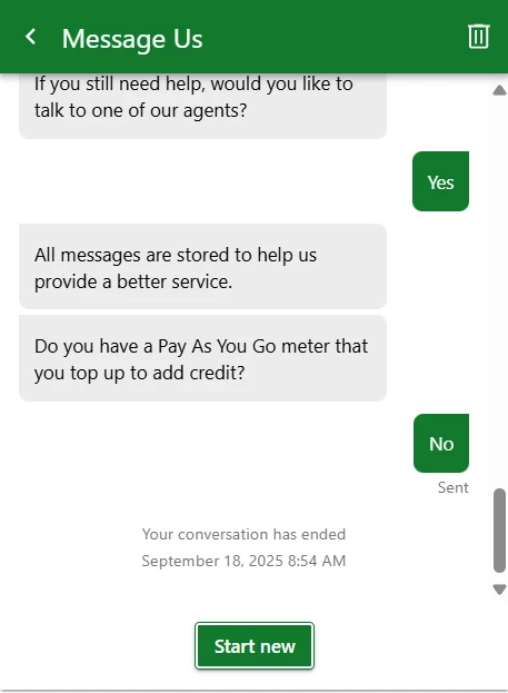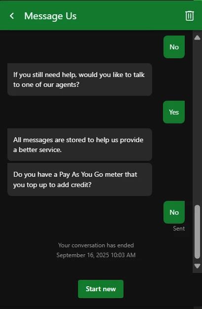 I have been trying to get help via the Chat with us option at OVO Energy Customer Help and FAQ. After going through the ID checks, the bot asks if I would like to talk to an agent, to which I answer Yes. Four times now, the next steps are these: