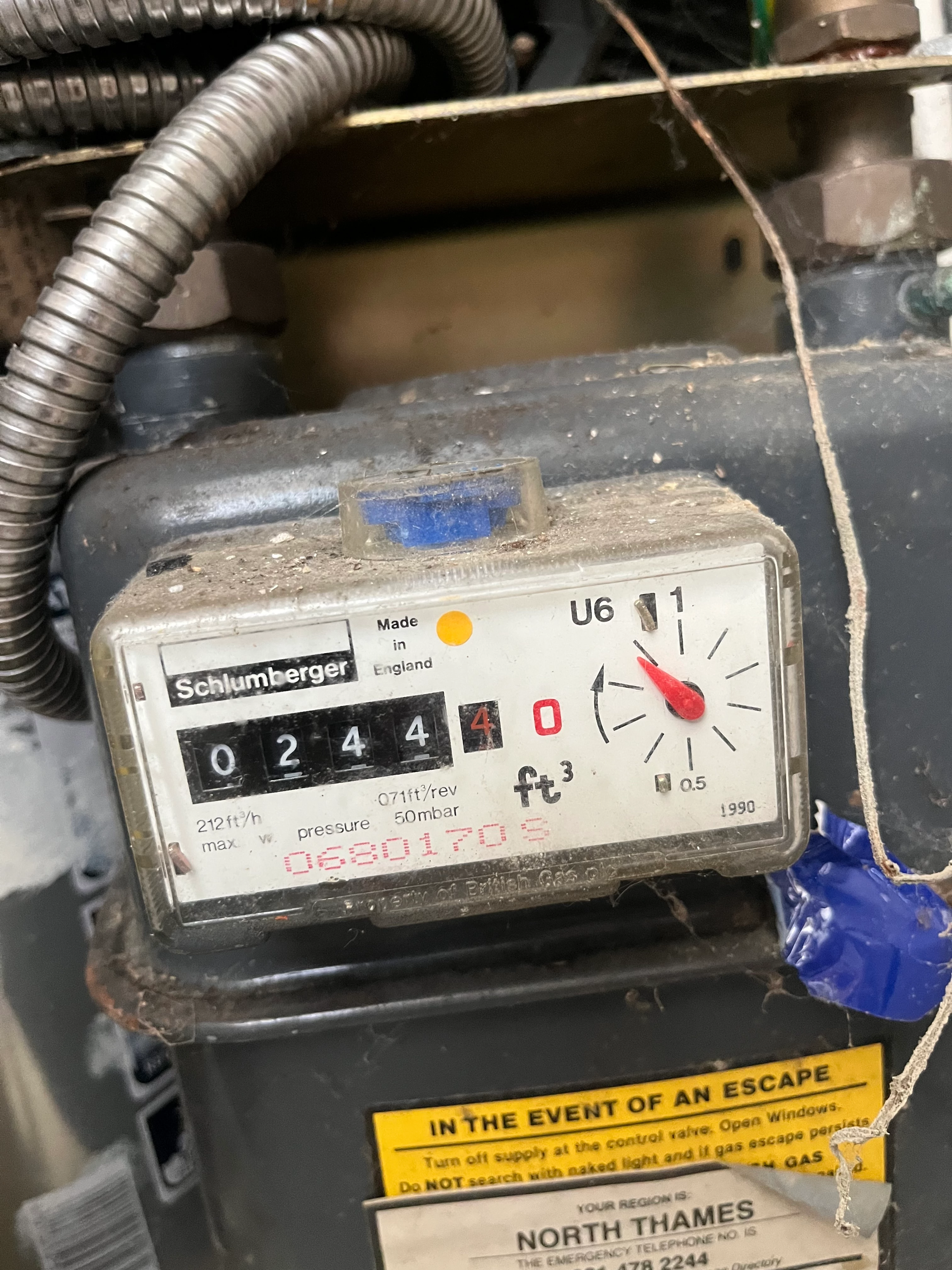 The meter is measuring in single ft³, but for submission to the supplier, you should give only the first four digits and ignore the ones highlighted in red. The meter in your picture is reading 0244 (x100 ft³). To convert a volume in 100s of ft³ to m³, multiply by 2.83.