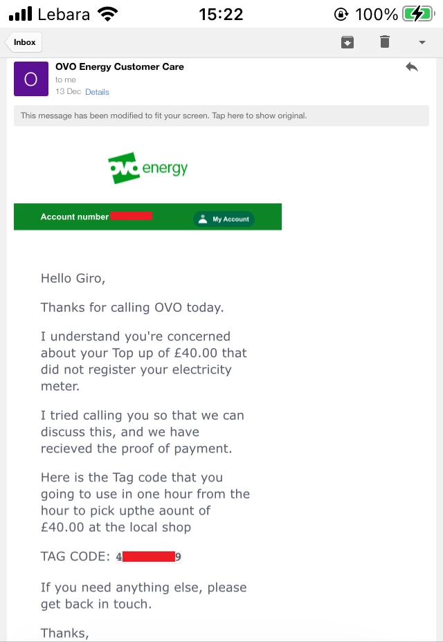 The following Monday I resumed the correspondence and discovered I had received a TAG CODE Saturday regardless and that supposedly I had missed a call from OVO also.