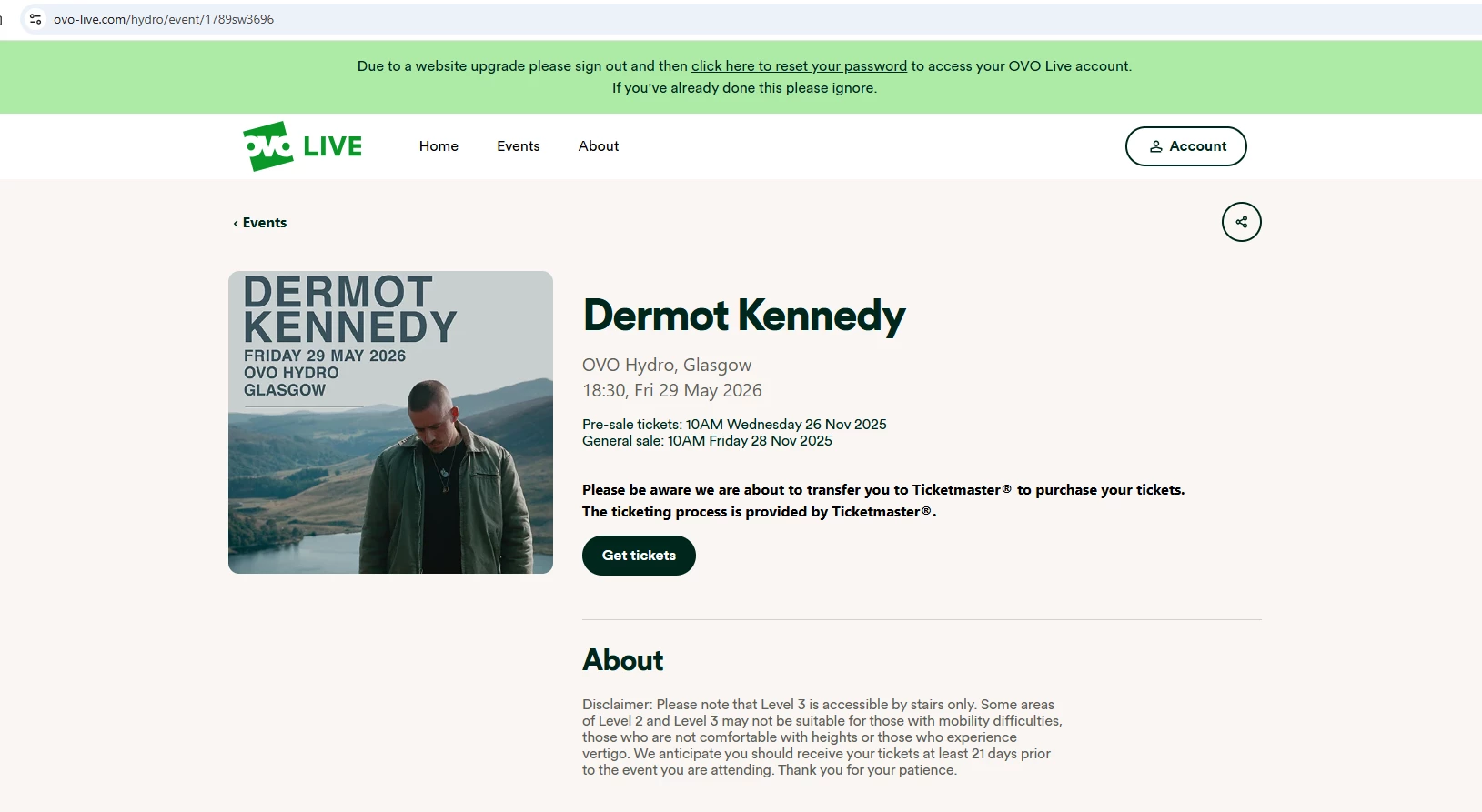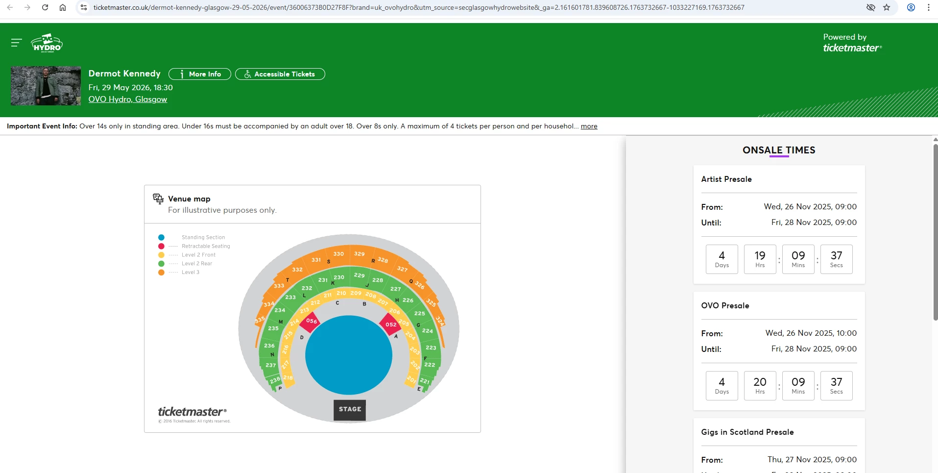 I hope that someone can help me with registering for pre sale tickets at the OVO Hydro. Tried phoning OVO and Hydro but would have been more useful phoning a butcher.