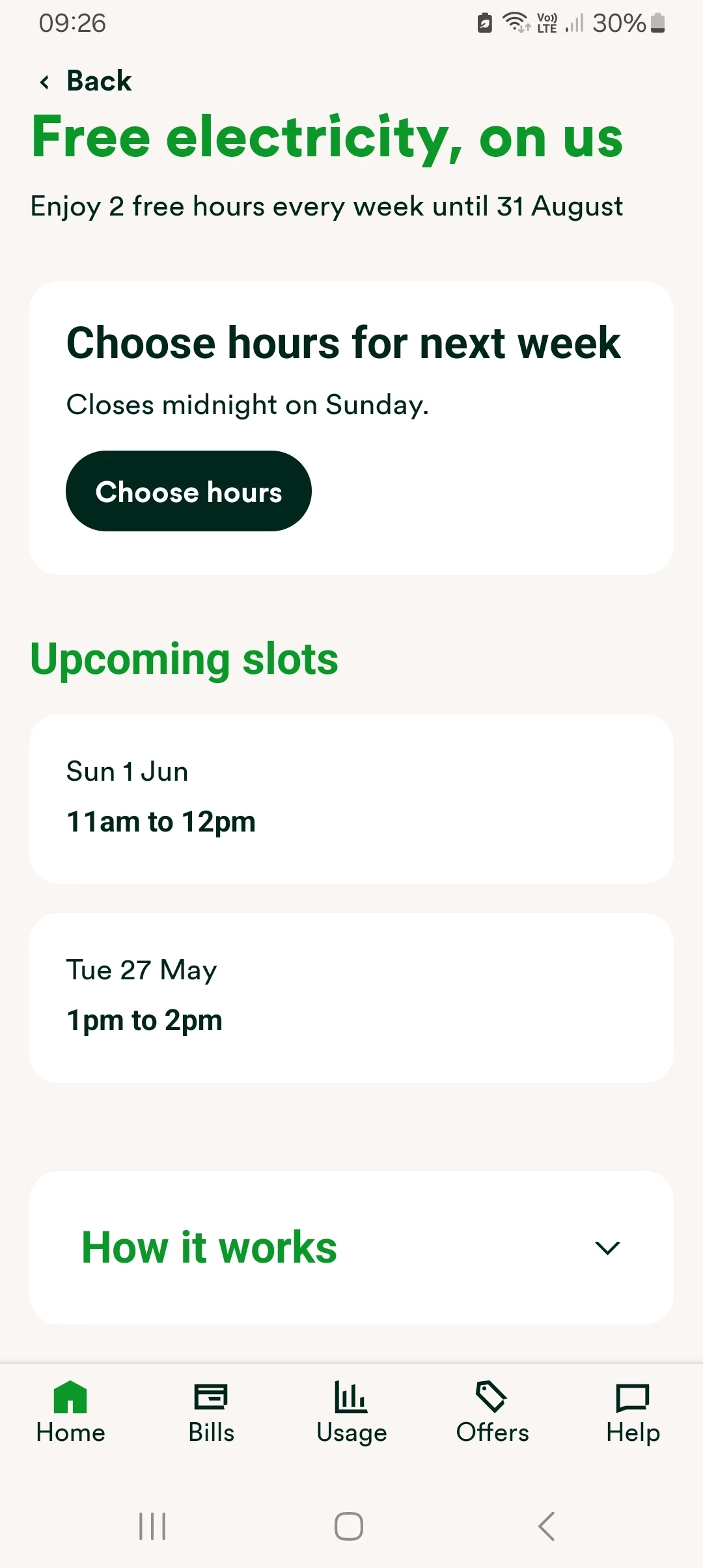 If you have a smart meter and pay by direct debit then you can download/install the OVO Energy app, open it and scroll down to Beyond where there is currently the 2 hours a week Free Electricity (I kWh per hour) reward.