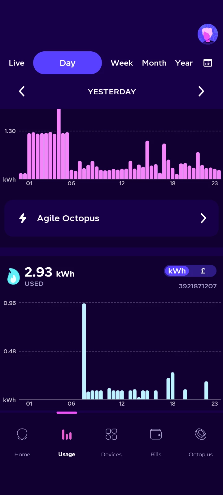 I moved to Octopus about two years ago with my SMETS1 meter and recently I needed a meter change to SMETS2 with an added component. It's the Octopus Mini Pod that allows my phone the be the IHD. It can decode the encrypted HAN signals (the ones that would go to an IHD) from the meter and send them to Octopus via my router forming a secure bridge between the two. Octopus then process the data into the normal format for present energy consumption and today's energy use. I've shown yesterday's readings because I haven't used any gas today as I have a heat pump taking the heating load at the moment whereas yesterday it was just a little bit colder and the gas boiler just came in a bit to help.