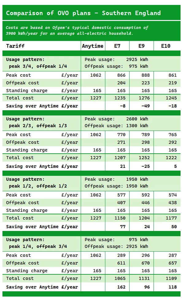 E10’s five hours overnight would normally manage to heat up enough water for two people, unless they both take deep hot baths every day. If showers fed from the hot water tank are involved, the five hours should be plenty. Electric showers are very expensive to run at peak rate. This table shows the various tariffs I could find; it’s not certain that Economy 9 is available in the Southern region, but I doubt the tariff would be published if it weren’t: